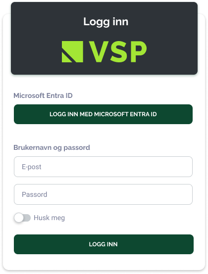 Vi tilbyr nå innlogging via Microsoft Entra ID, slik at dere kan bruke eksisterende Microsoft-brukere og sikkerhetsinnstillinger direkte i VSPs administrasjonsløsning.